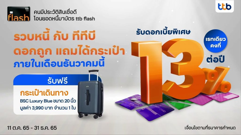- อัตราดอกเบี้ยเริ่มต้นที่ 13% และสามารถโอนยอดหนี้จากบัตรเครดิตหรือบัตรกดเงินสดจากสถาบันการเงินอื่นมาที่ ttb เพื่อรับอัตราดอกเบี้ยที่ต่ำกว่า